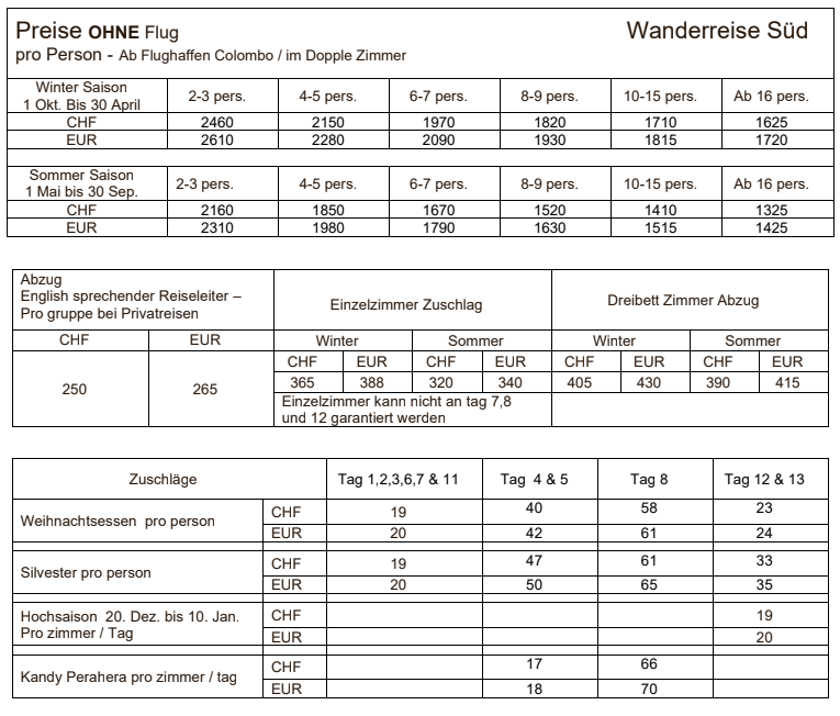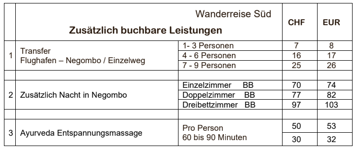 Trinkgelder, nicht erwähnte Mahlzeiten, Getränke, sowie persönliche Ausgaben.